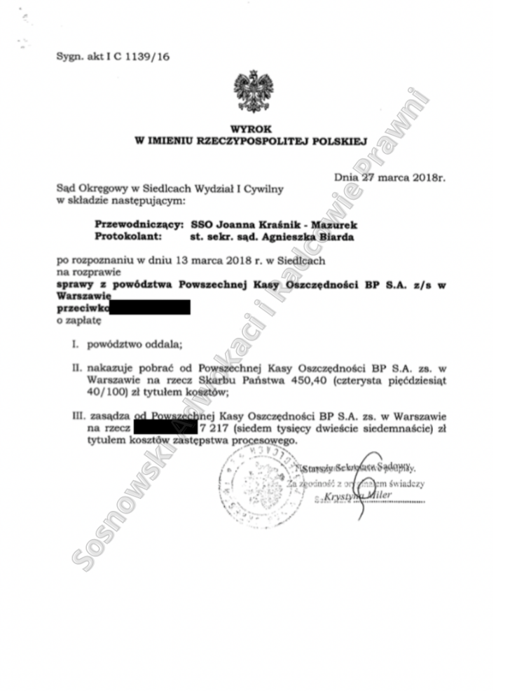 — Sąd Okręgowy w Siedlcach, uzasadnienie wyroku I C 1139/16 z 27 marca 2018 r. (sprawa prowadzona przez Sosnowski Adwokaci i Radcowie Prawni)